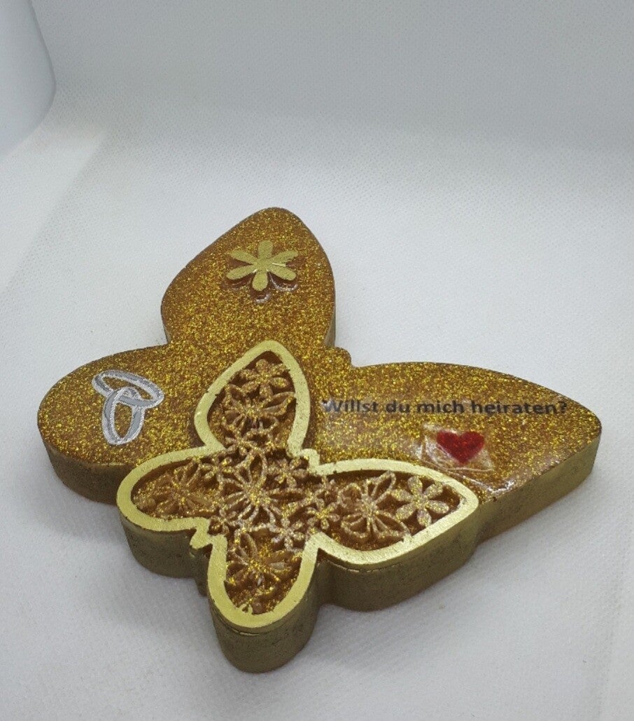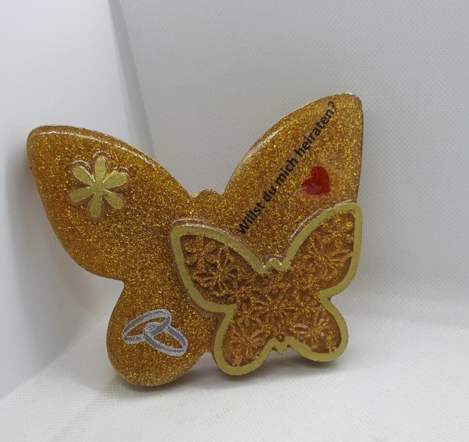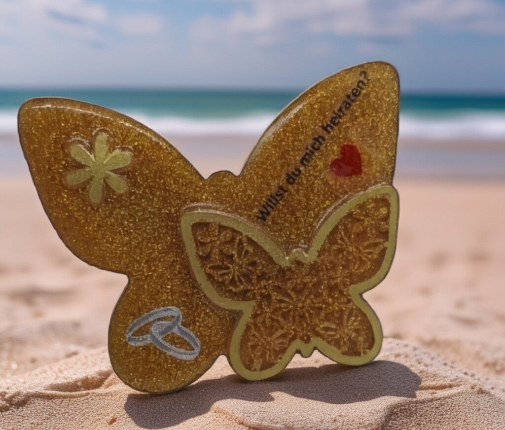 Schmetterling in Gold mit Ringen und der Frage willst du mich heiraten mal die etwas andere Art einen Heiratsantrag zu machen.
