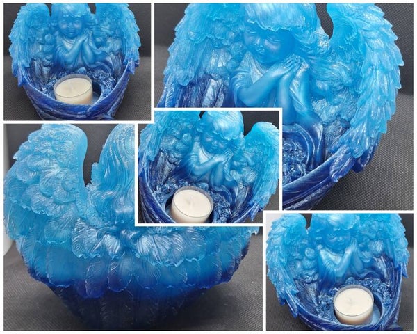 Teelichthalter Engel in Blautönen gegossen aus Dickschichtigem Epoxidharz ( bedeutet ohne Bläschen )