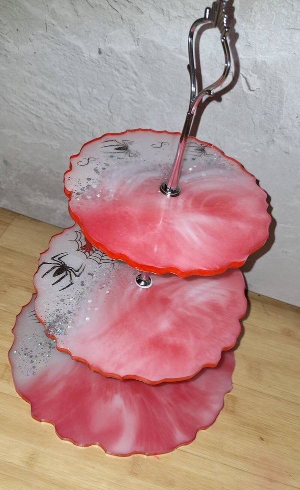 Eine Etagere für Spidermanfans. Gehalten in weiß/rot leicht rosa mit Akzenten und Details. Die Herstellung dieser Etagere dauerte 2 Tage. Die Wasserschiebefolie die ich verwendet habe ist auch von mir selber hergestellt wurden.
