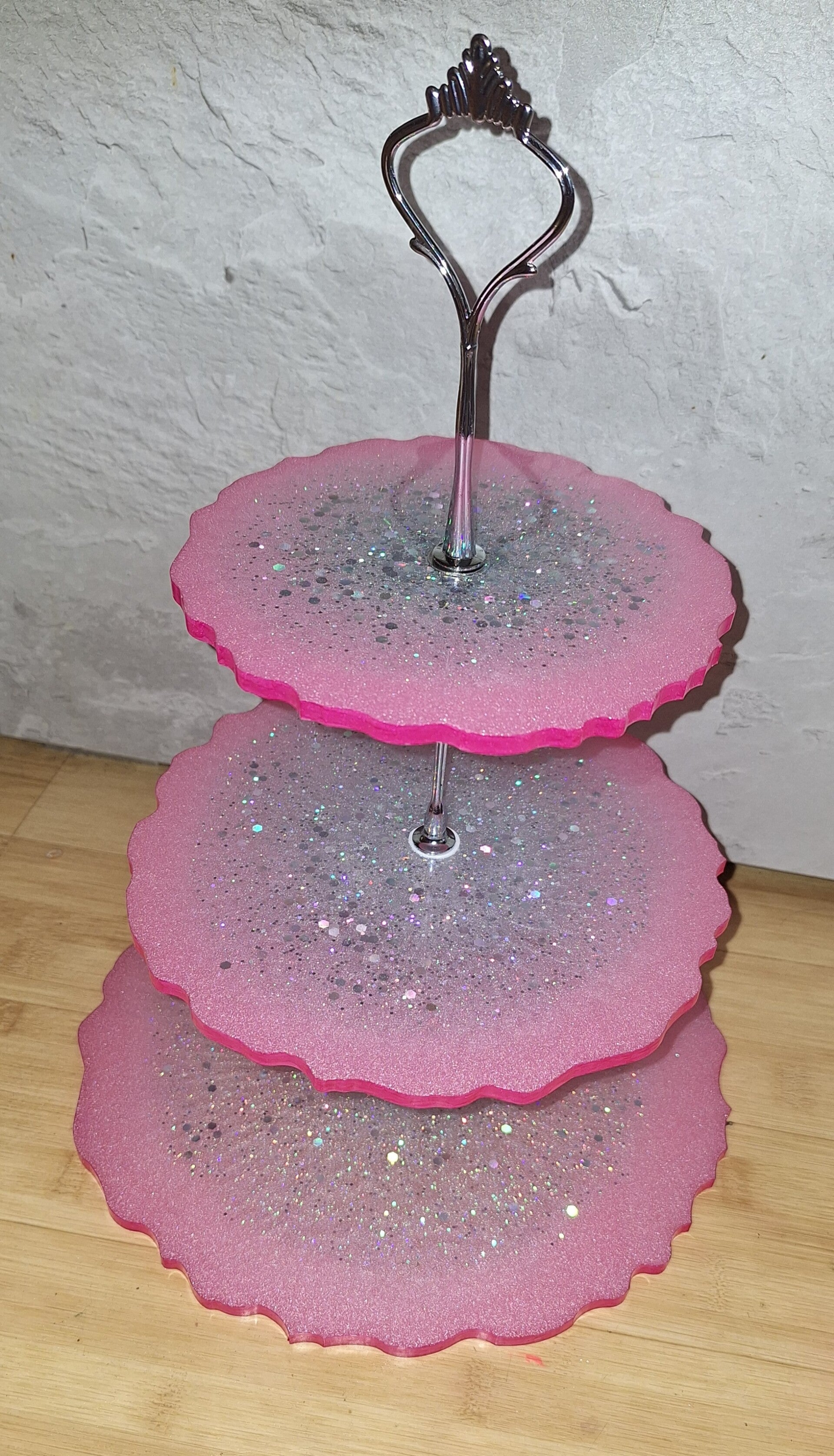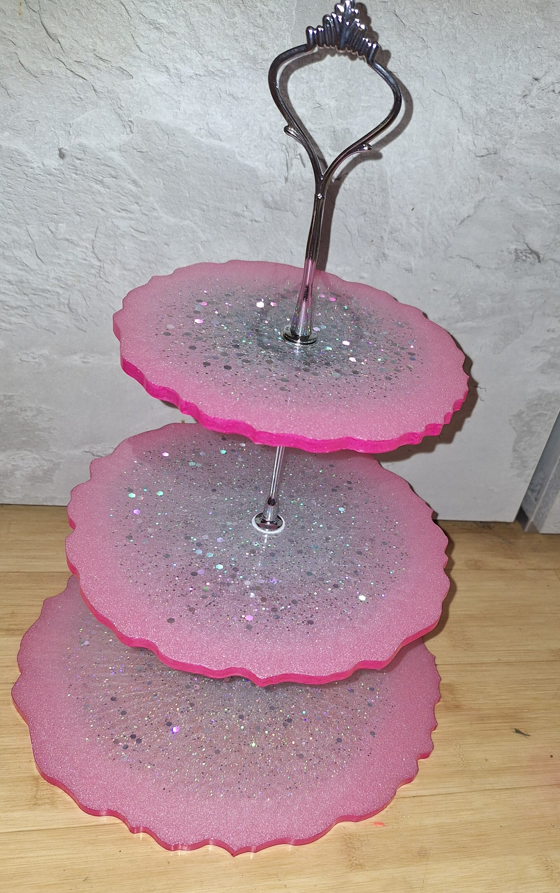 Diese Etagere ist in rosa/pink gehalten mit Glitzer in der Mitte.