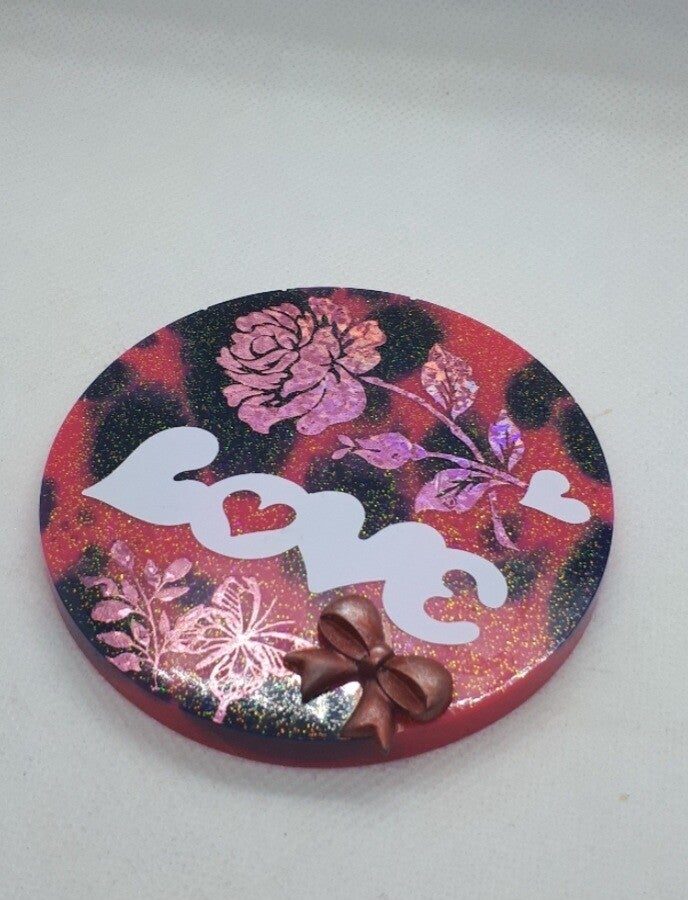 Mit Glitzer Rose und Schmetterling, kleine Schleife. Aufschrift Love in weiß.