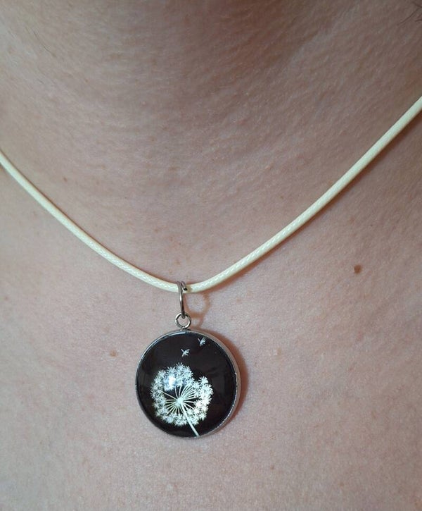 25 mm groß, Wachskordelkette in weiß. Verstellbar.