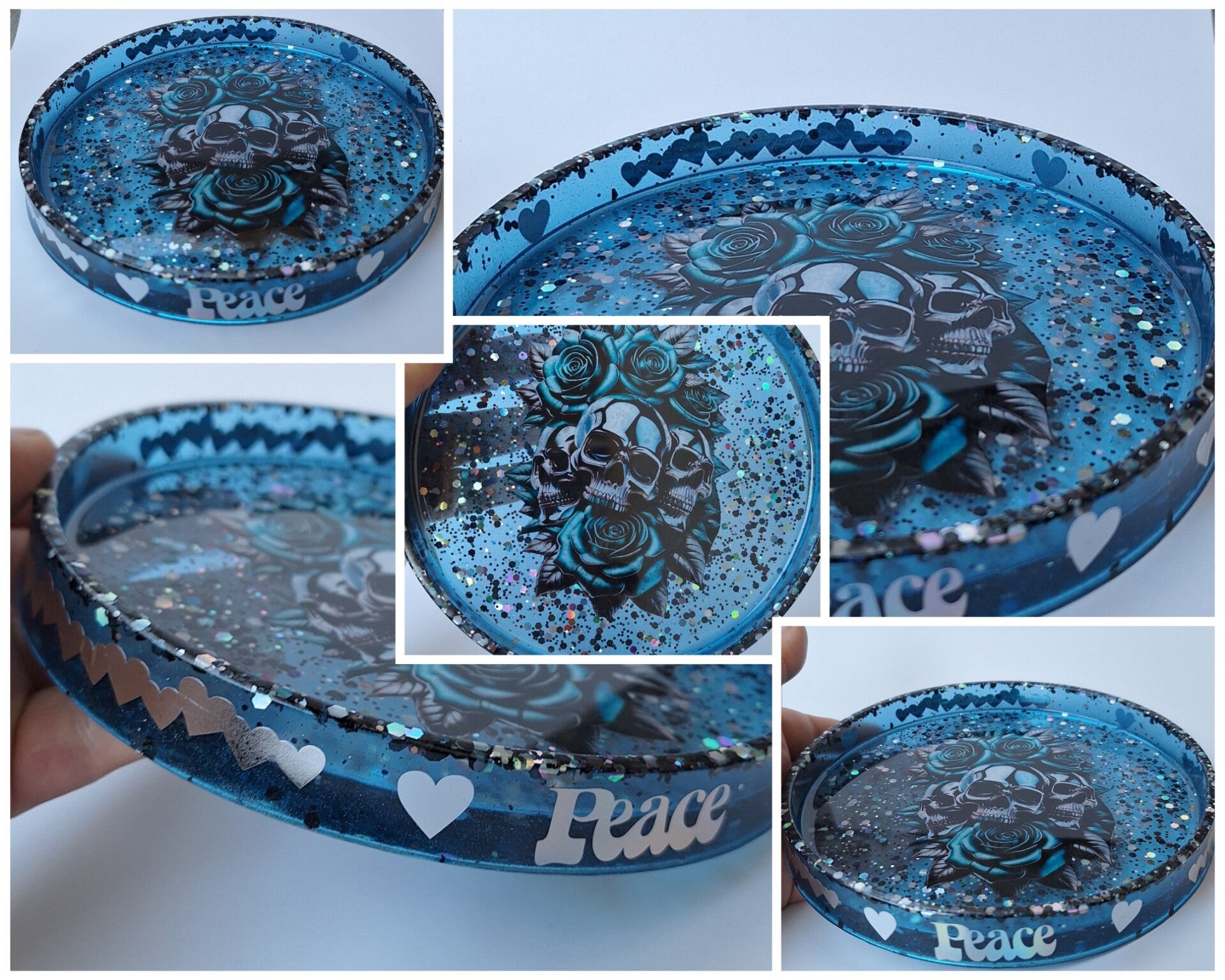 Mit Glitzer, Peace vorne als Schrift umrandet mit Herzen.