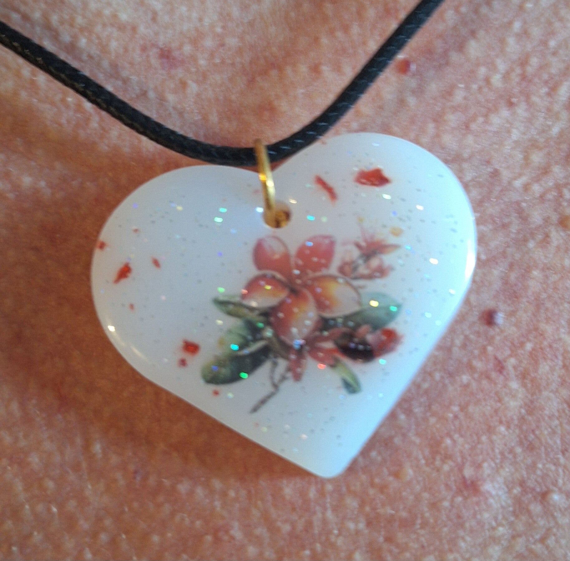 Herzform mit eingearbeiter Wasserschiebefolie Blume und leichtem Glitzer. Wachskordelkette in schwarz.