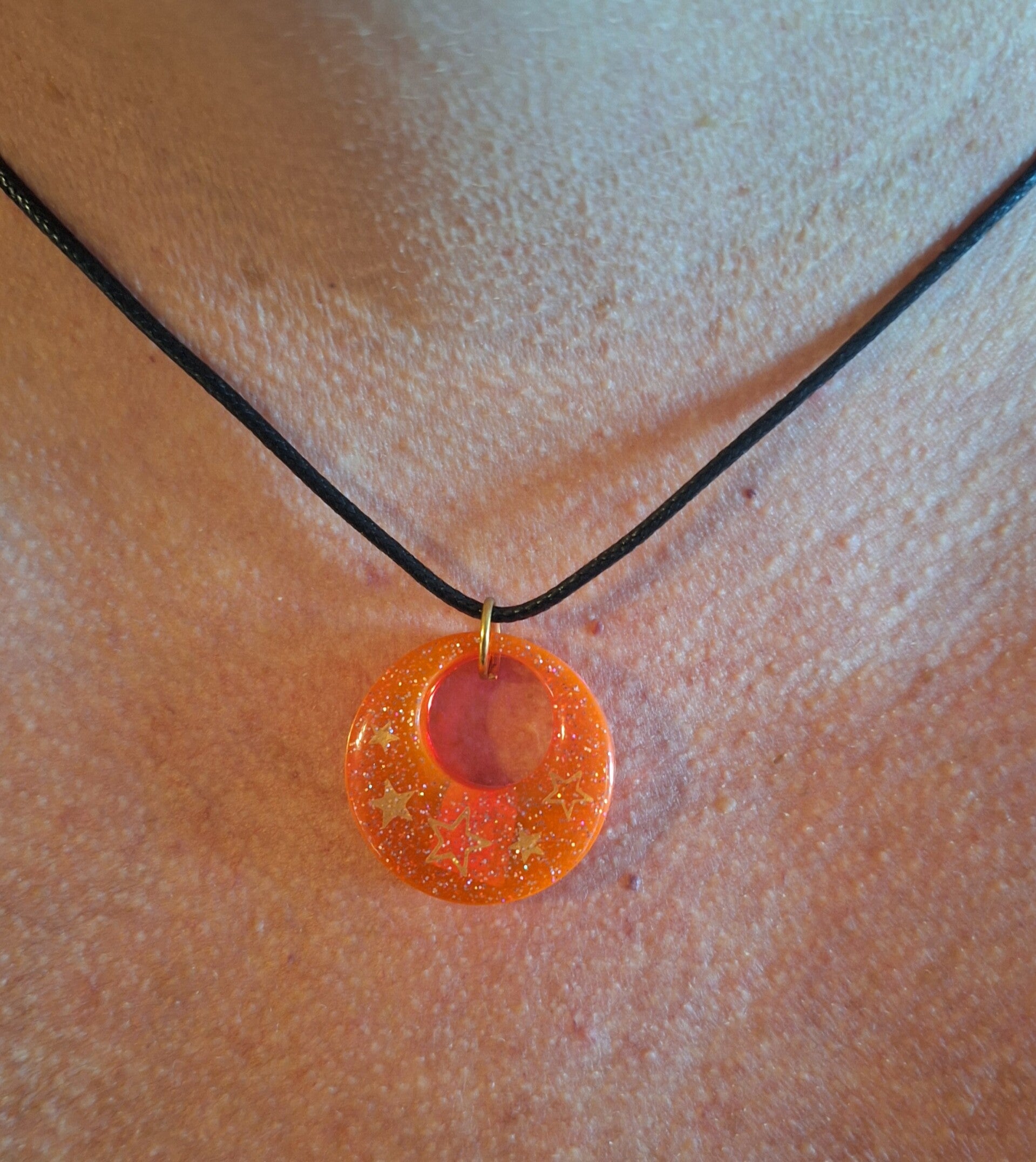 Anhänger mit Loch mittig ,mit Sternchen verziert. Wachskordelkette in Schwarz.
