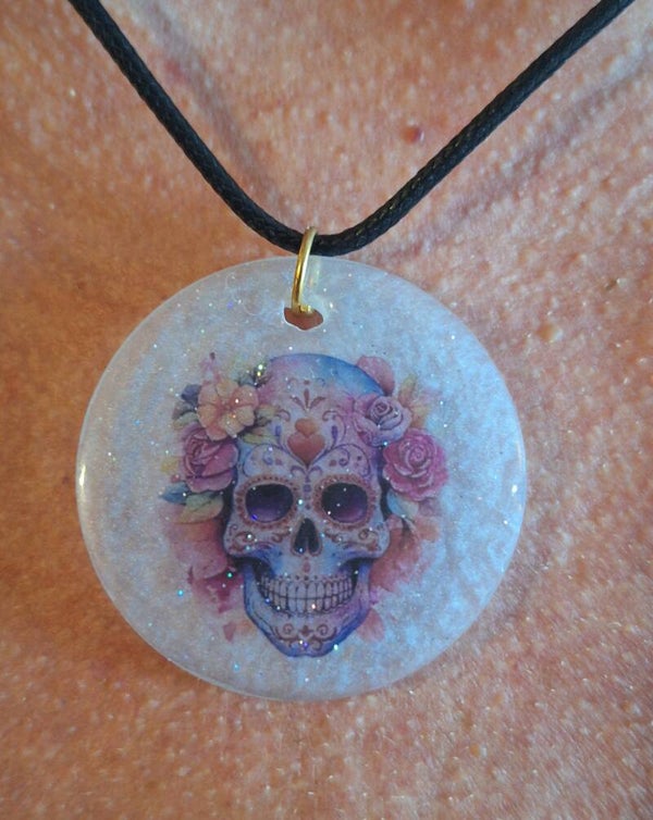 Mit eingearbeiter Wasserschiebefolie Totenkopf und leichtem Glitzer. Wachskordelkette in Schwarz.