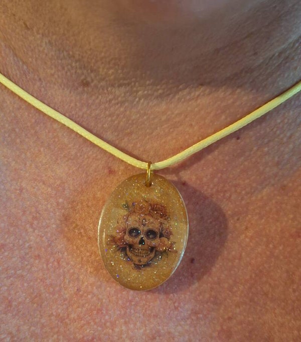 Totenkopf als Wasserschiebefolie eingearbeitet. Mit Glitzer. Anhänger Ovale und golden.